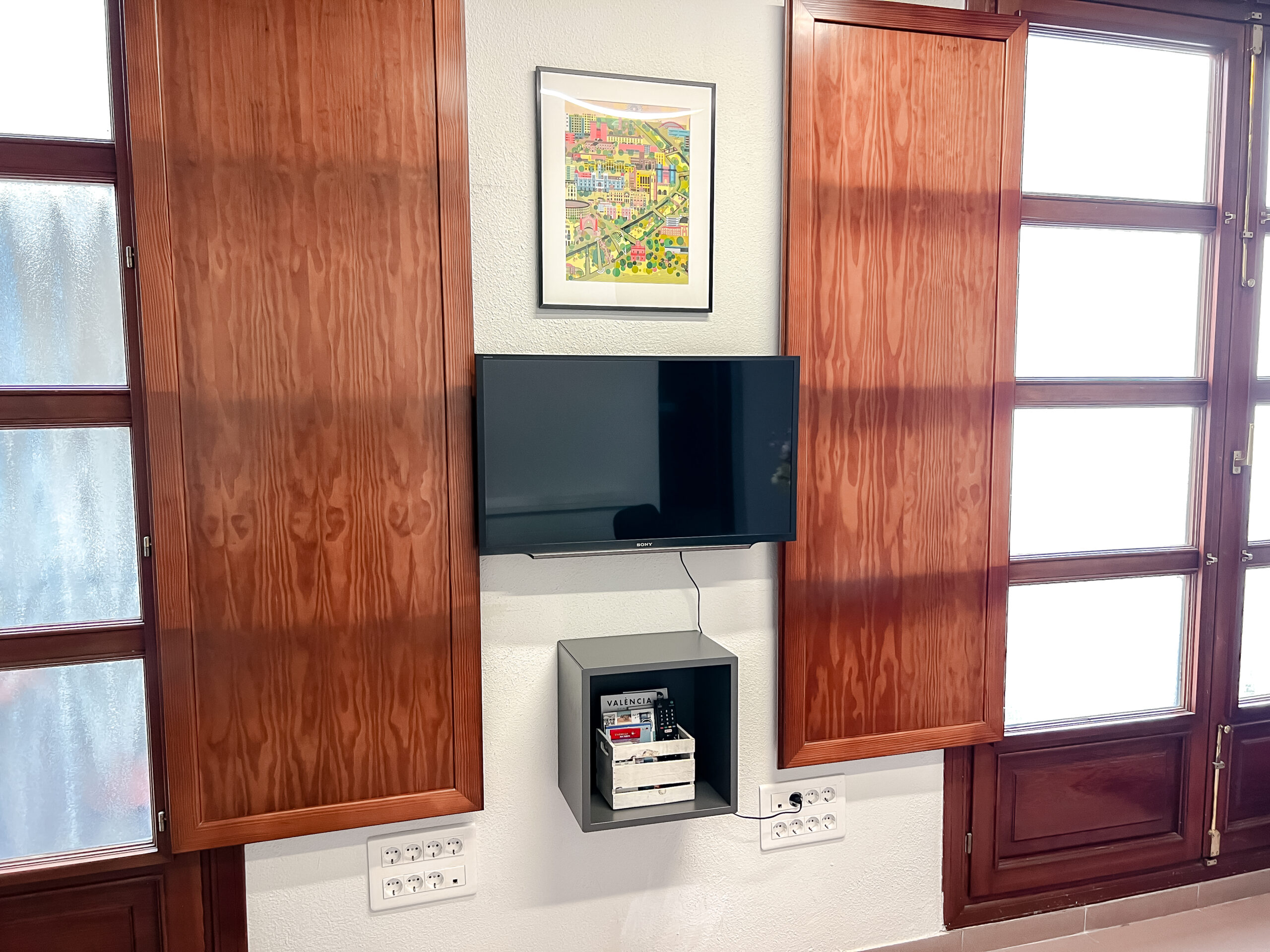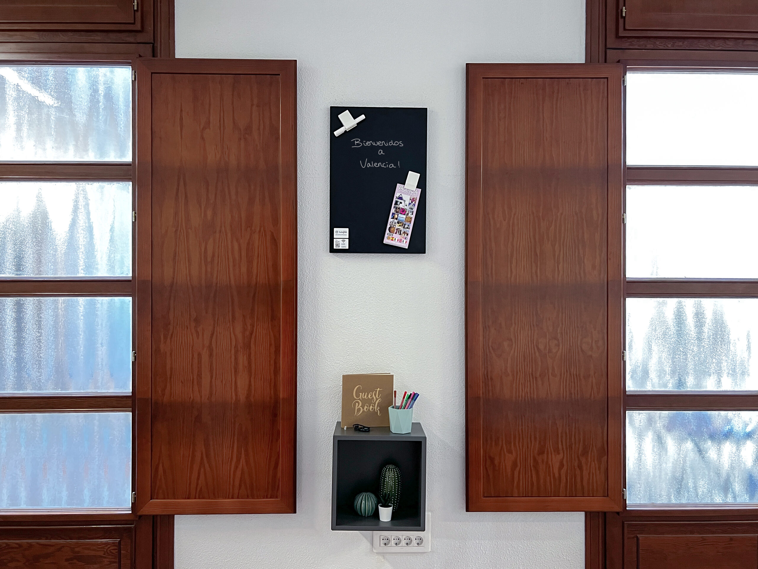 Casa Desiré is a spacious (74 m2) and bright holiday apartment in Valencia. It has 4 meter-high ceilings with wooden beams and large wooden double doors to a private balcony which is accessible from both the living room and bedroom. You can view Valencia’s fresh food market Mercado Central from the balcony.